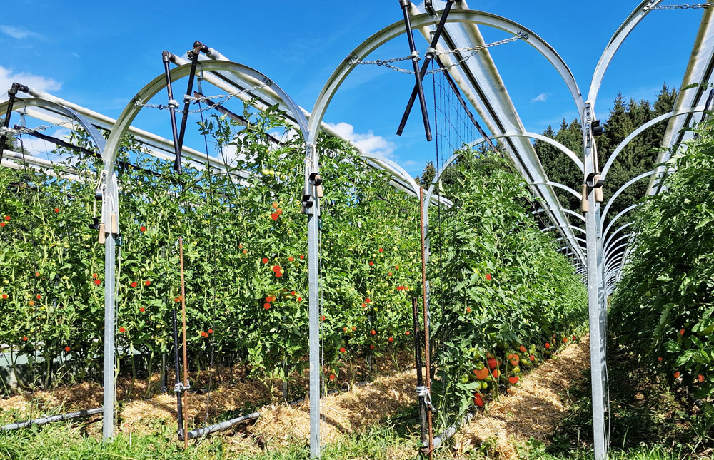 Unsere Tomatenreihen klettern in malerischen Bogen-Tunnels an einem grobmaschigen Netz hoch. Die Tunnels sind in der Regel offen. Wir haben aber die Möglichkeit, bei extrem nasskaltem Wetter die Tomatenstauden von oben und von der Seite zu schützen, wobei wir diesen Regenschutz nur für ca. 10 bis 20 % der Tageszeit anwenden. Die Sonne scheint also voll auf die Tomaten. Nur durch direkte Sonneneinstrahlung bildet sich jenes einzigartige Aroma der echten Freiland-Tomate.